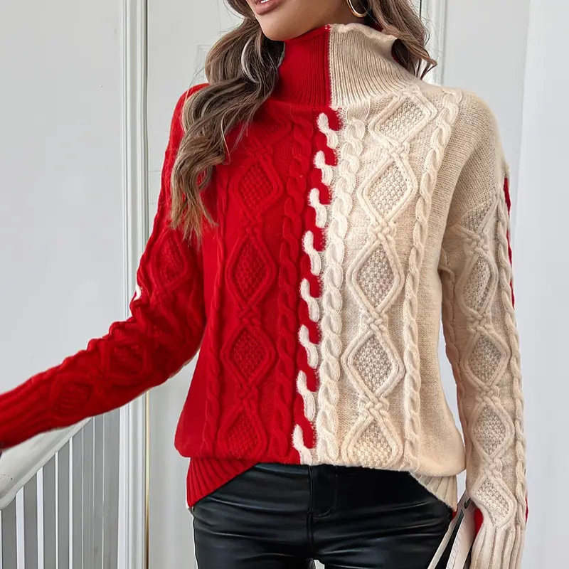 Denne to-tonede vintergenseren gir deg både komfort og stil i kalde dager. Med sitt elegante høyhalset design, intrikate kabelstrikkmønster og fargerike kontraster, blir du både varm og moteriktig hele sesongen.