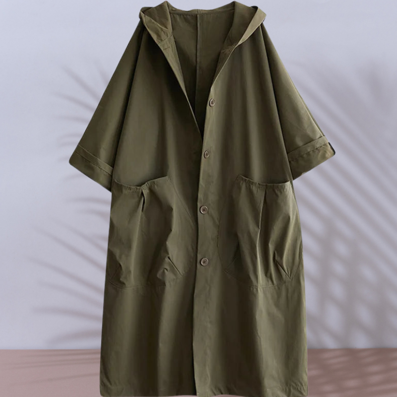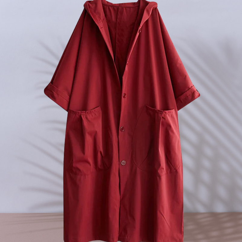 Denne lange vanntette frakken gir deg full beskyttelse mot regn, samtidig som du opprettholder en elegant og feminin silhuett. Med praktiske lommer, hette og sikker glidelås, er du alltid klar for uforutsigbart vær.