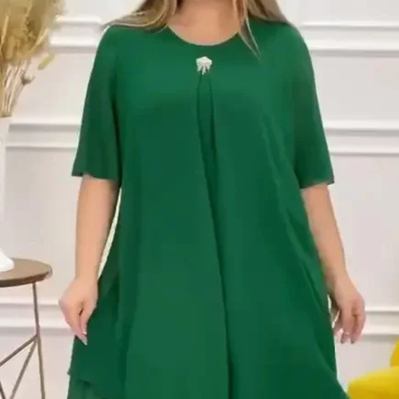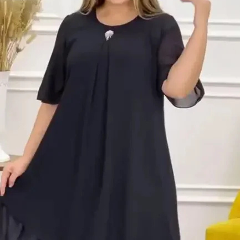Denne chiffonkjolen kombinerer letthet og eleganse, perfekt for både hverdagsbruk og spesielle anledninger. Det myke stoffet gir en flytende følelse, mens designet fremhever en feminin og sofistikert stil.