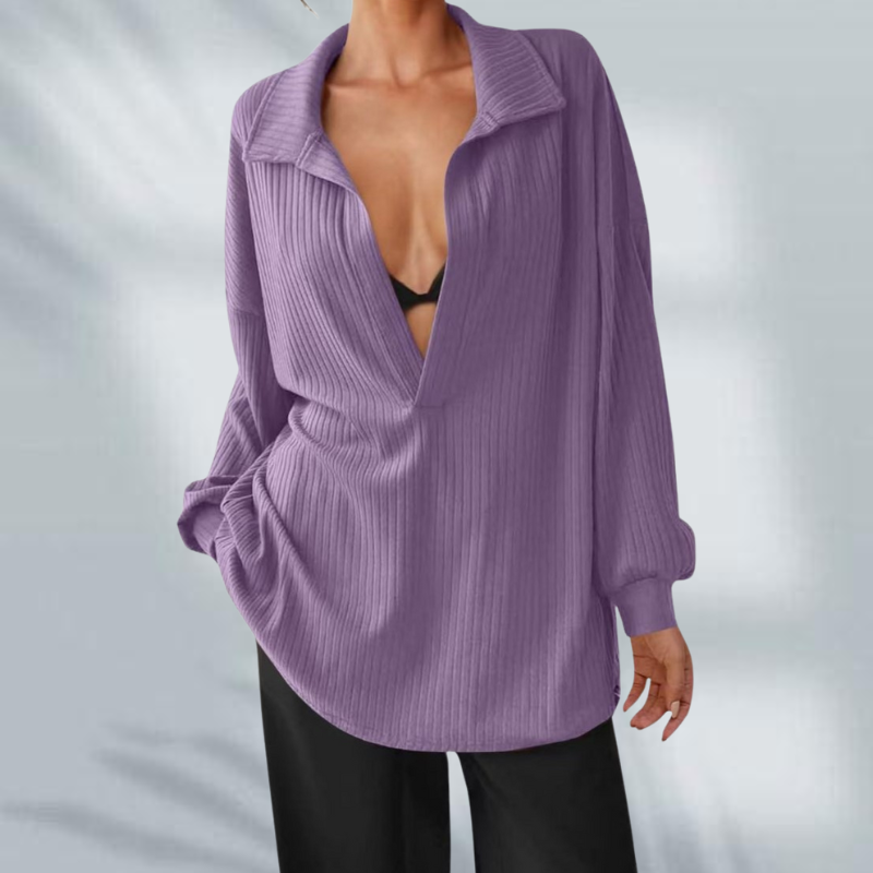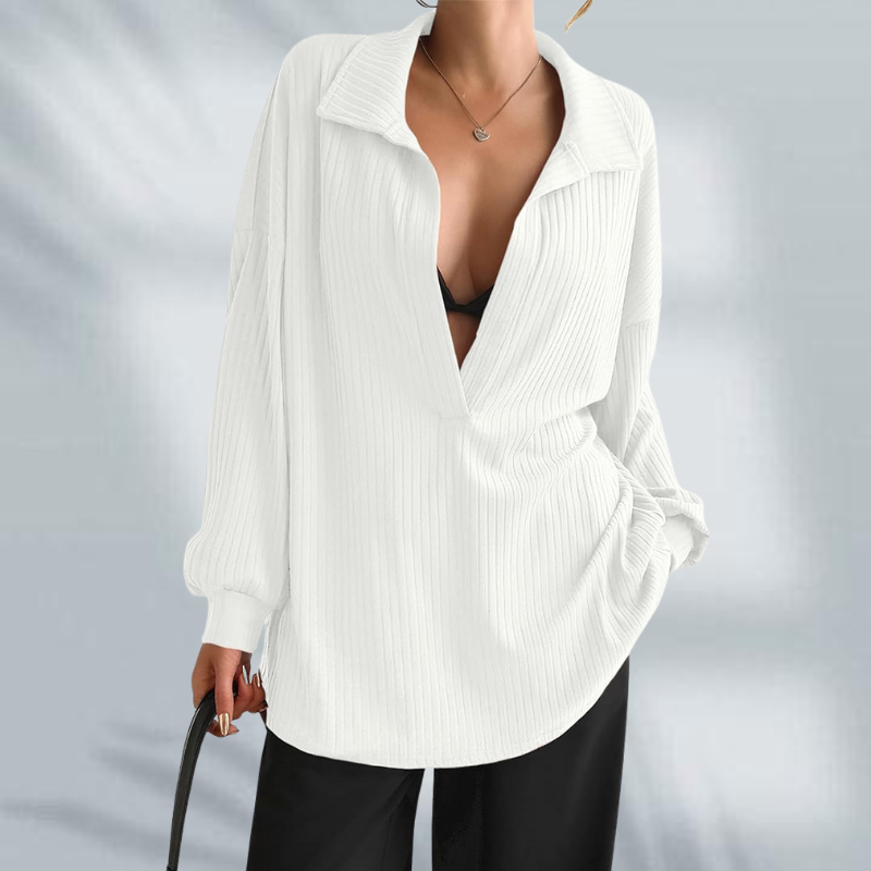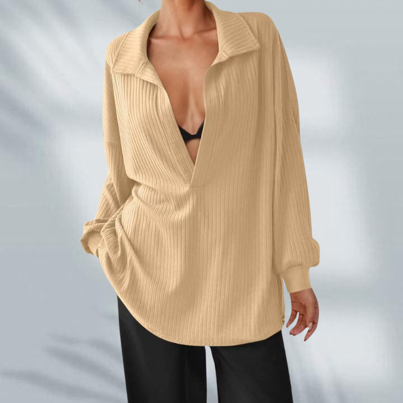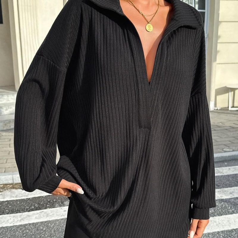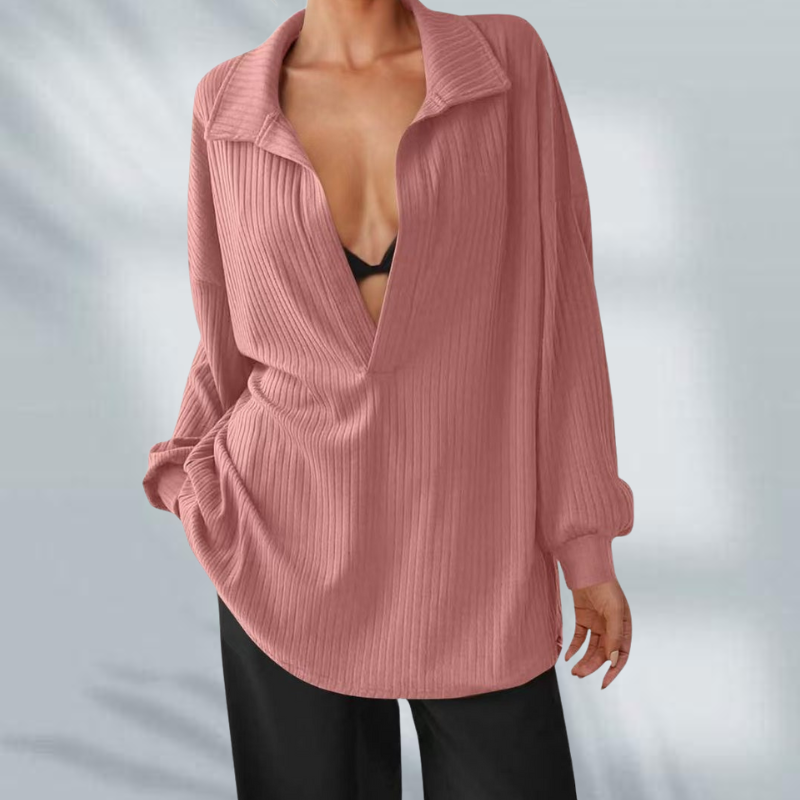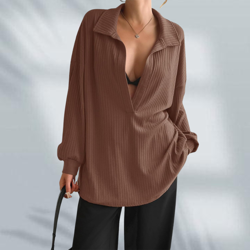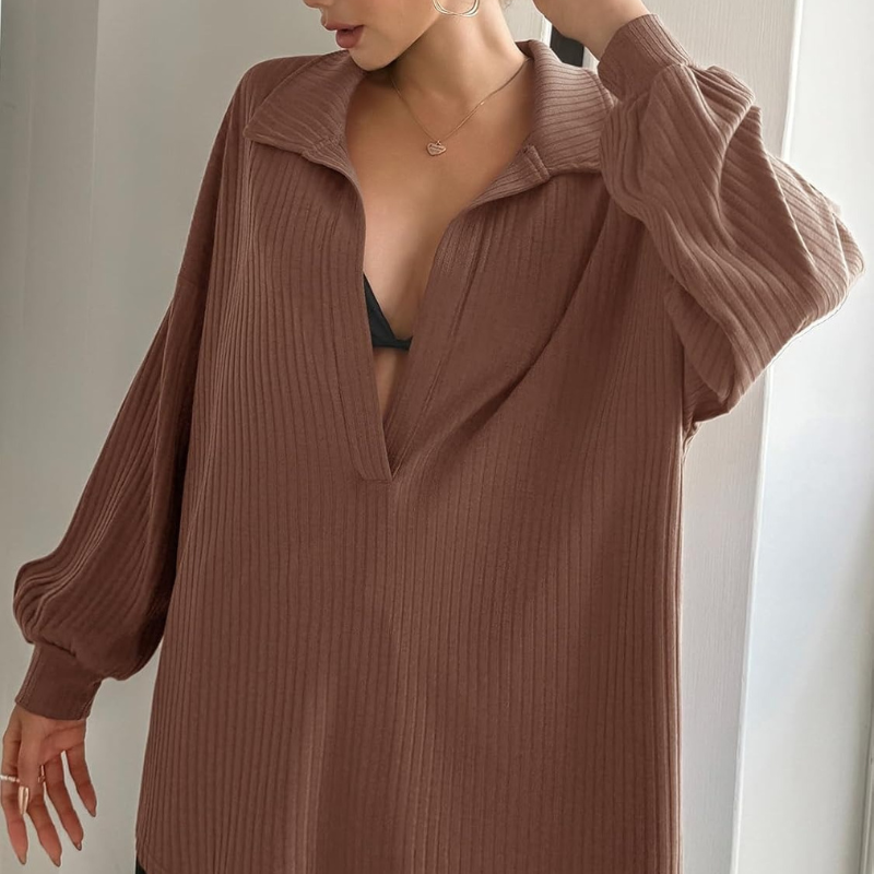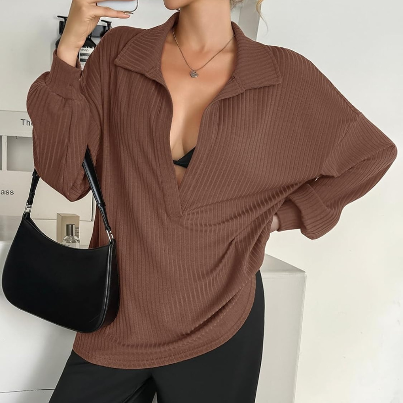 Denne oversizede vaffelstrikkede genseren har en dyp V-hals og lange ermer som kombinerer stil og komfort. Perfekt for høstgarderoben, den gir et moderne uttrykk samtidig som den føles myk og behagelig mot huden.