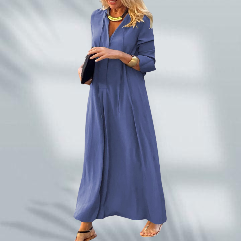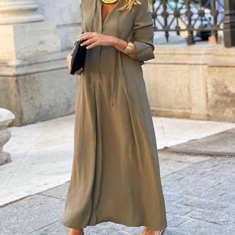 Denne elegante kjolen kombinerer komfort og stil med sin flatterende V-hals og lange ermer. Laget i mykt polyester som gir en lett og behagelig følelse, perfekt både til hverdags og spesielle anledninger.