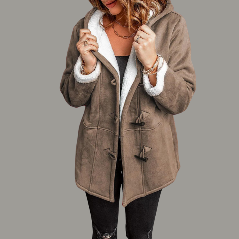 Du ser etter en komfortabel, varm og tidløs kåpe som beskytter deg mot kulde og vind. Denne hettejakken i semsket materiale med fleecefôr og hornknapper gir deg både funksjonalitet og et moderne uttrykk hele vinteren.