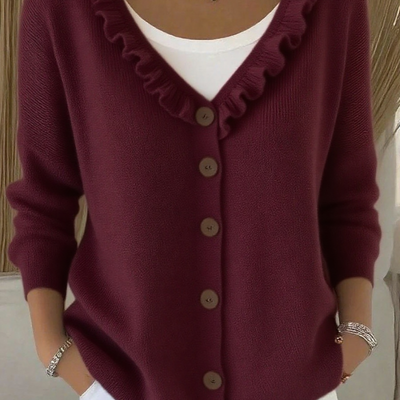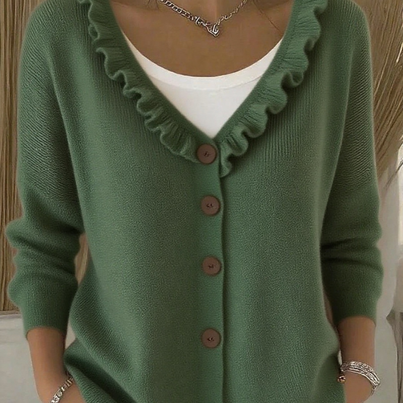 Denne volangstrikkede cardiganen kombinerer komfort og tidløs stil i ett. Med sin løse passform og myke bomullsstoff gir den deg både bevegelsesfrihet og varme perfekt til hverdags, jobb eller koselige kvelder hjemme.